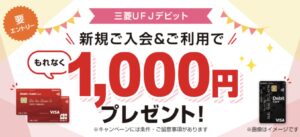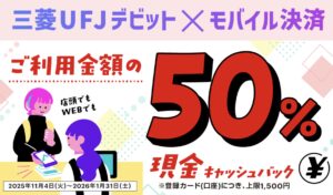 三菱UFJデビットをモバイル決済で、50%還元(最大1,500円)の現金キャッシュバックがあります。(エントリー必須)