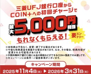 エアウォレットアプリで、三菱UFJ銀行口座から3万円以上を初回チャージで5,000円もらえます。(エントリー必須)
