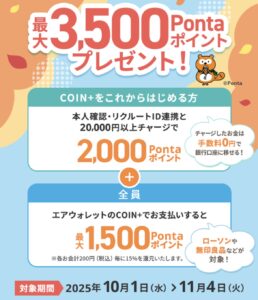 - 期間中にエアウォレット(COIN+)で支払いすると15%還元で最大1,500円分Pontaポイント