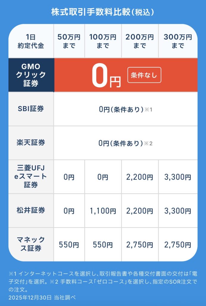 特にGMOクリック証券は、国内株式と投資信託の手数料が無条件で完全無料です。