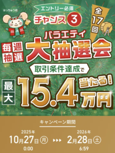 毎週エントリーして条件を達成すると、抽選で現金プレゼントを開催中です。毎週金曜日15:30時点で株式残高3万円以上で当選確率2倍になります。(詳細)