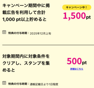 - 期間中に広告を利用し、11/30までに通帳に1,000P(1,000円相当)以上「有効」と記載されると1,500円分ポイント