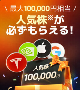 紹介リンクから口座開設&入金で、Appleやエヌビディア、テスラ、メタなどの有名企業株が最大10万円分当たります。
