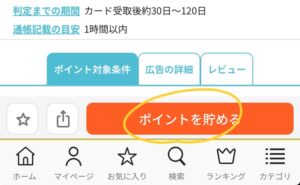 - ハピタスの楽天カードページで条件をよく読み、「ポイントを貯める」ボタンを押して、楽天カード公式ページへ行く