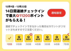 - 14日間連続で「チェックイン」ボタンを押す